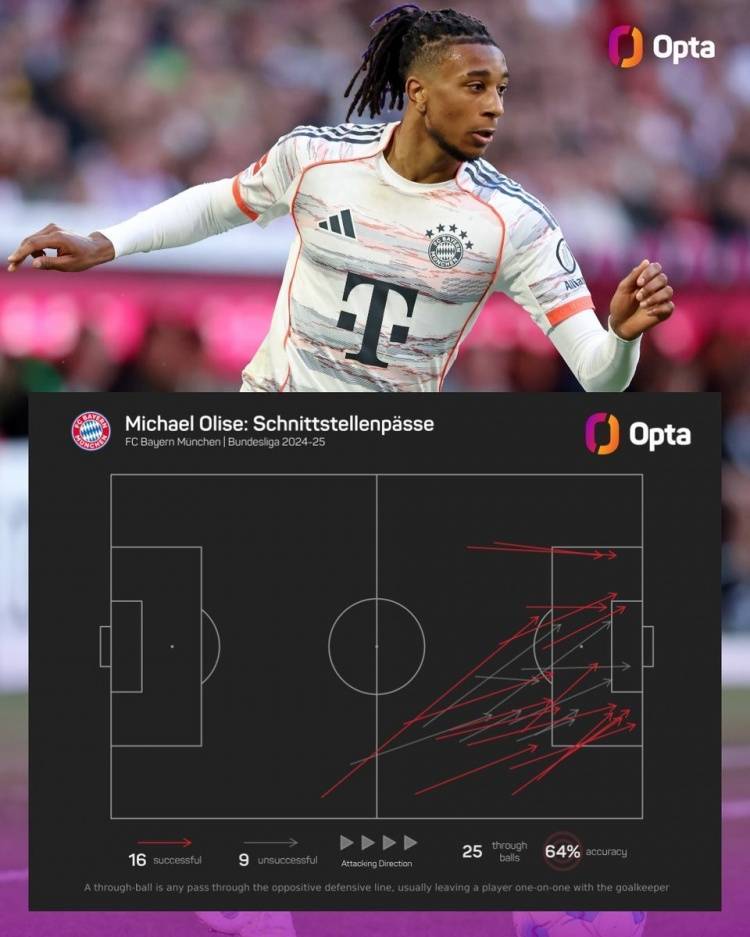 34场德甲12球15助攻!奥利塞上赛季16次成功直塞是德甲同期最多